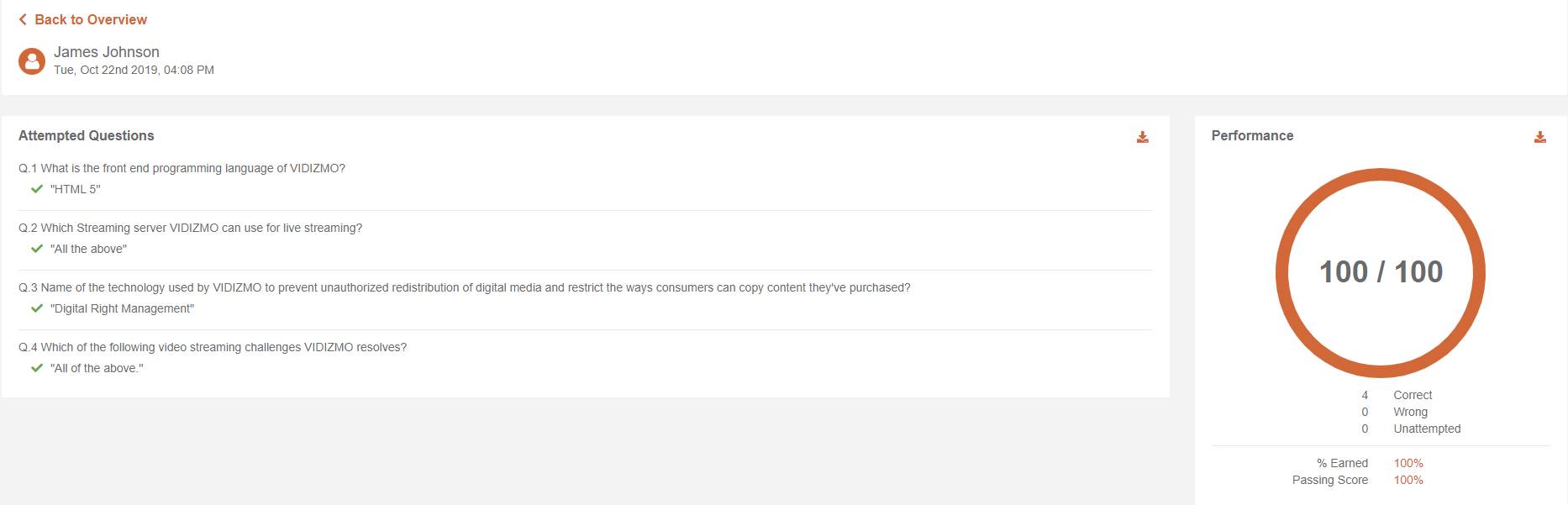 VIDIZMO brings a unique touch to mundane quiz reports which get away by telling you an average score of participants and the count of those who passed alongside those who did not.