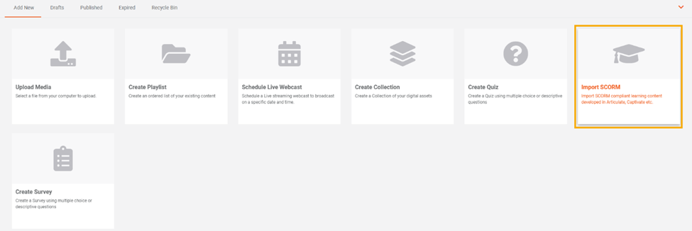 Note: The text for the import SCORM button can be different due to VIDIZMO allowing high branding functionality, allowing users to customize such aspects of the portal you are trying to upload media to. Click Understanding Branding Settings to learn more.