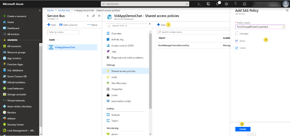 Now you need to create another SAS Policy with different permissions. Using your Azure Portal, on the same Shared Access Policy screen as the last step: i. click Add to create a new Shared Access Policy. ii. Type in a name for the policy. Select Send and Listen. iii. Click Create to proceed. You will be notified 'Successfully created SAS Policy'. Copy Primary Key of the newly created policy, like in the previous step. This key is going to be required while configuring Live Chat in VIDIZMO.