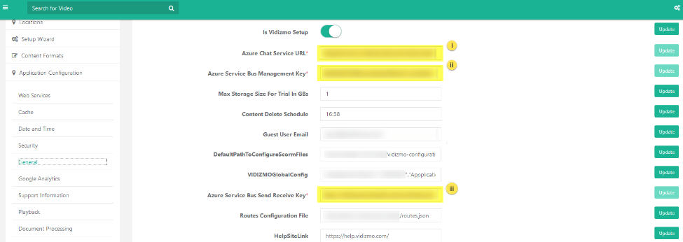 ii. Azure Service Bus Management Key: Key used for authentication by VIDIZMO to access and communicate with Azure Service Bus. This is the Primary Key copied in Step 2 while configuring Live Chat in Azure Portal. iii.Azure Service Bus Send Receive Key: Key used to send/receive messages in a chat room. This needs to be separate from the Management key because it is exposed at the client side for communication using Azure directly, hence enhancing security. This is the Primary Key copied in Step 3 while configuring Live Chat in Azure Portal.
