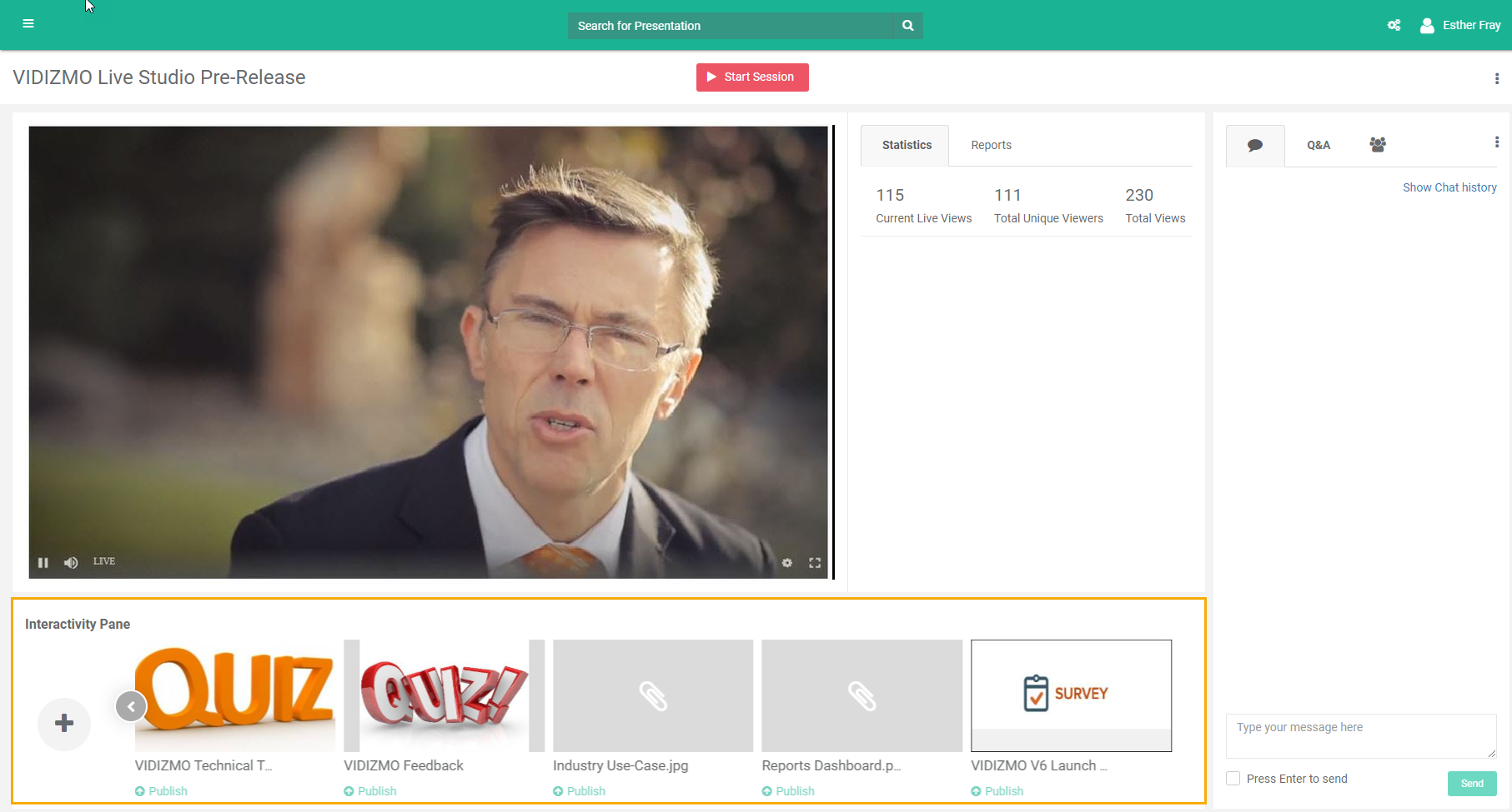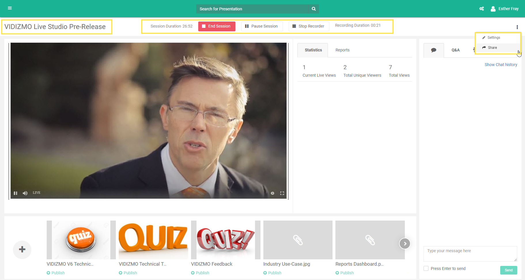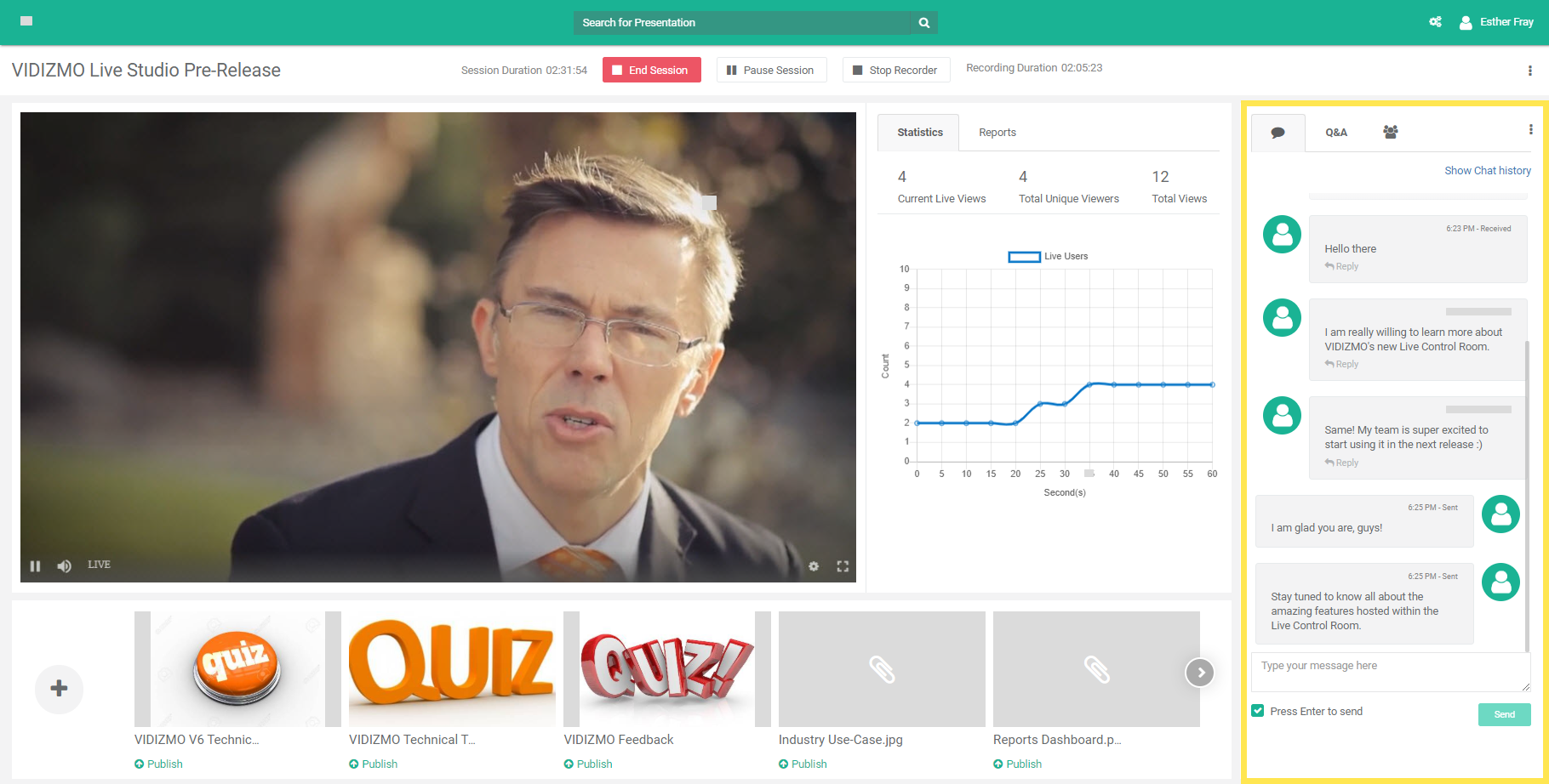 In the tab adjacent to Statistics, you will see reports for the Quizzes and Surveys you published during the live session to better understand how your audience is interacting with them. Following is an example of how live reporting of a Quiz (that is live right now) shall be displayed for your assistance. The Live Quiz shall also have an indicator against it for quick correspondence.