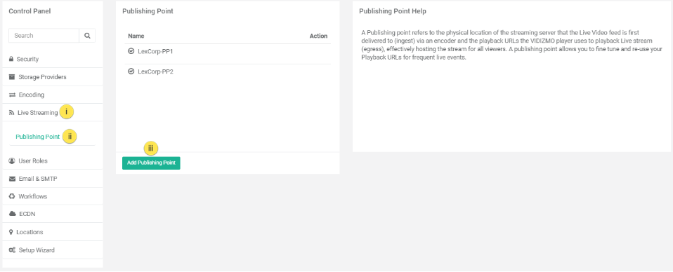 Follow the steps below to learn how to create a Publishing Point for live streaming in VIDIZMO: