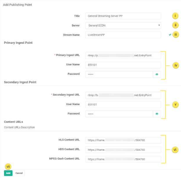 i. Enter the Title for your Publishing Point. ii. Now, select a Server from the dropdown list. In the Server field, you can select from the list of names appearing in the drop-down. These values and are populated from the "Title" field when setting up the ECDN from Admin > Control Panel> ECDN > Add ECDN. Now, choose the Wowza Streaming Cloud Server Node that you configured using How to Configure General Streaming Server Provider. iii. Give your stream a uniquely identifiable name. iv. Enter details for your Primary Ingest Point which will be provided to you by your Streaming Service Provider. v. Enter details for your Secondary Ingest Point, also known as the Backup URL which will be provided to you by your Streaming Service Provider. This URL serves as a backup Ingest URL in case the first one is down.