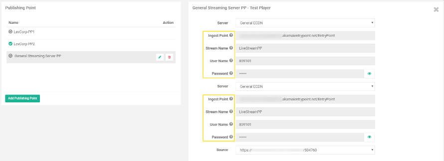 Note: Ingest Point URLs and credentials are taken for display purpose, only to ease the process of setting up an encoder using this publishing point.
