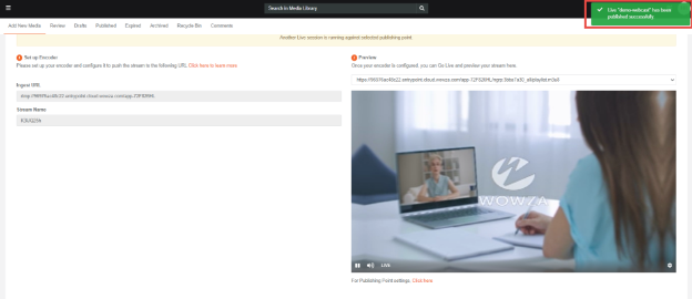 Upon scheduling a live webcast and subsequently clicking the save button, you will promptly receive a notification confirming the successful publication of the live webcast.