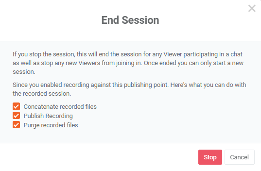 Note: Please note that your recorded files are saved with respect to the publishing point against which the live stream was pushed. This entails that if you do not purge recorded files for a session, when you record another session using the same publishing point, then all of the above three options shall apply on all recordings saved previously against this publishing point. For example, concatenation shall stitch all recordings from this session as well as previous sessions held using this publishing point. Hence, it is highly recommended to purge recorded files (or permanently move them elsewhere), if you wish to reuse a publishing point for another live session. Similarly, if you do not purge recorded files for one session and record another live session without checking 'Concatenate recorded files', then the next recorded session will be overridden by the first one - essentially losing your current recording.