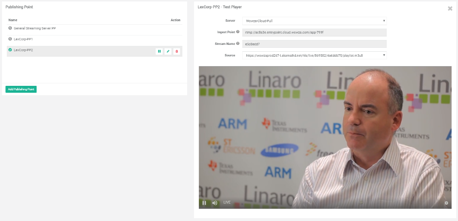 Here, you need to follow the steps in this article to set up a Publishing Point using Wowza Streaming Cloud Server with details of how you would like to stream your live session. This includes what encoder would you be using, its settings and the aspect ratio you would like your stream to have for end-viewers, etc.
