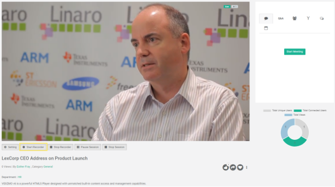 VIDIZMO gives you the ability to directly record your live stream from play back page, using Start Recorder option: