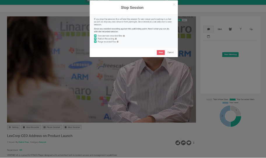 VIDIZMO allows organizations to record their content, be it for internal communication or global product launches, process it to be accessible to millions of devices and distant geographical locations, and to reach their targeted audience within a few seconds of scheduling a live webcast. All of this comes bundled with secure access rights to protect your live content and great interactivity options to engage your viewers anytime anywhere.