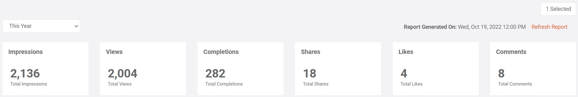 VIDIZMO allows you to select the duration for which you need to view the analytics. This duration can be last or a current week, month, or year. Moreover, users can also select to view reports for a specific time period only. As shown in the image below, VIDIZMO's detailed media stats during the current year for a video include:
