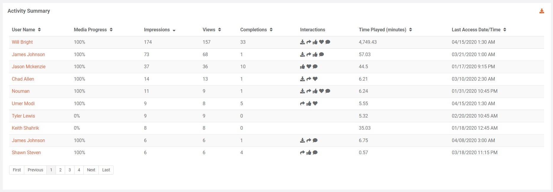 VIDIZMO allows you to see user activity on the selected media in the activity summary table.
