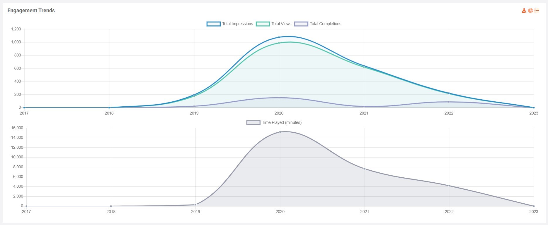 This is the graphical representation of the number of impressions, views, completions and time played during the time specified.