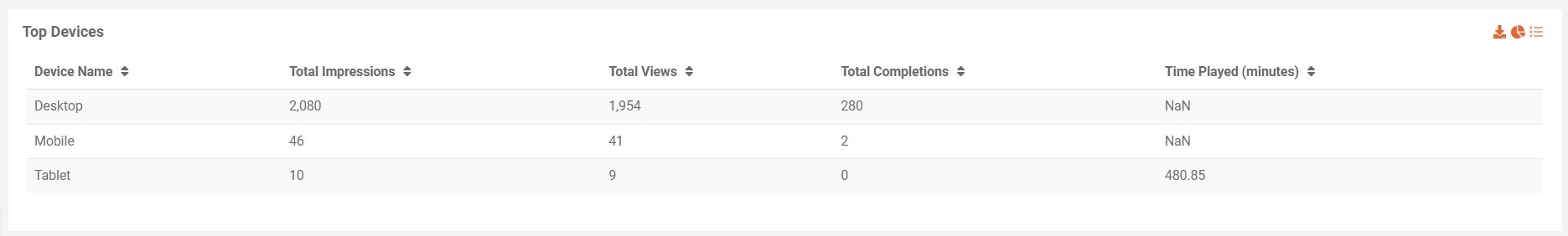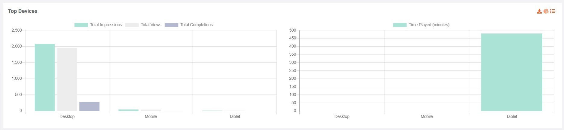 This is a bar graph for the devices used to watch the video. For example, it shows the impressions, views, completions, and time played in the video via desktop, mobile and tablet browsers.