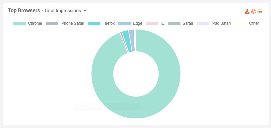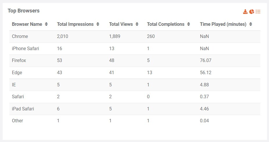 This is a pie chart showing the most played videos in different browsers, you can select dropdown to choose options (impressions, views, completions, and time played).
