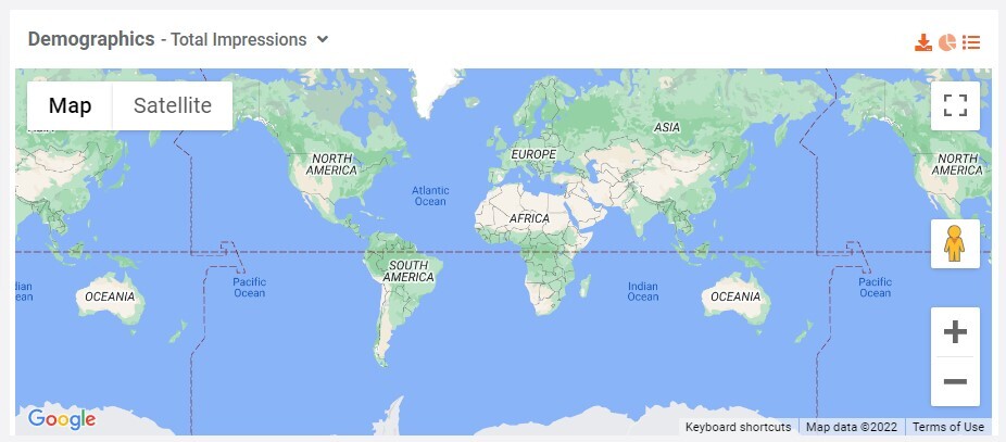 This is a heat map showing the intensity of impressions, views, completions, and time played throughout the geographical area, you can select dropdown to choose options (impressions, views, completions, and time played).