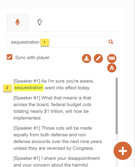 In the transcription panel, enter a term, i.e., Sequestration (i), in the Search field, and if the searched term is found, all its instances get highlighted.