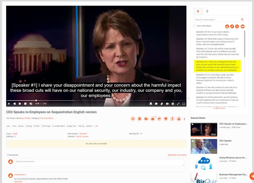 - Search in closed captions (CC): Using its automatic speech recognition (ASR) software, VIDIZMO also generates closed captions or video subtitles that display the text version of spoken words on the video screen adding clarity to video and audio files. The text in the closed captions is indexed so you can search by words or on-screen subtitles that appear in a video. Moreover, CC increases the searchability and also assists those with hearing disabilities, an accessibility requirement for 508 Compliance. VIDIZMO supports CC for audio and video files with support for both existing closed captions or manually generated human transcripts to improve video search. VIDIZMO also enables indexing of all translated video transcripts and caption files so the user can search for terms within the video in their preferred language.