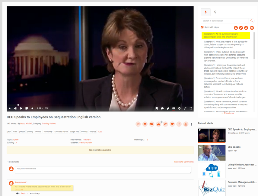 Search using speech recognition: VIDIZMO's offers automatic speech recognition (ASR) software to provide machine transcription, which helps index every spoken word in the video, thereby allowing users to search for any keywords or phrases spoken in a video. This way, users can quickly skip to any precise portion of the video where the searched keyword is used.