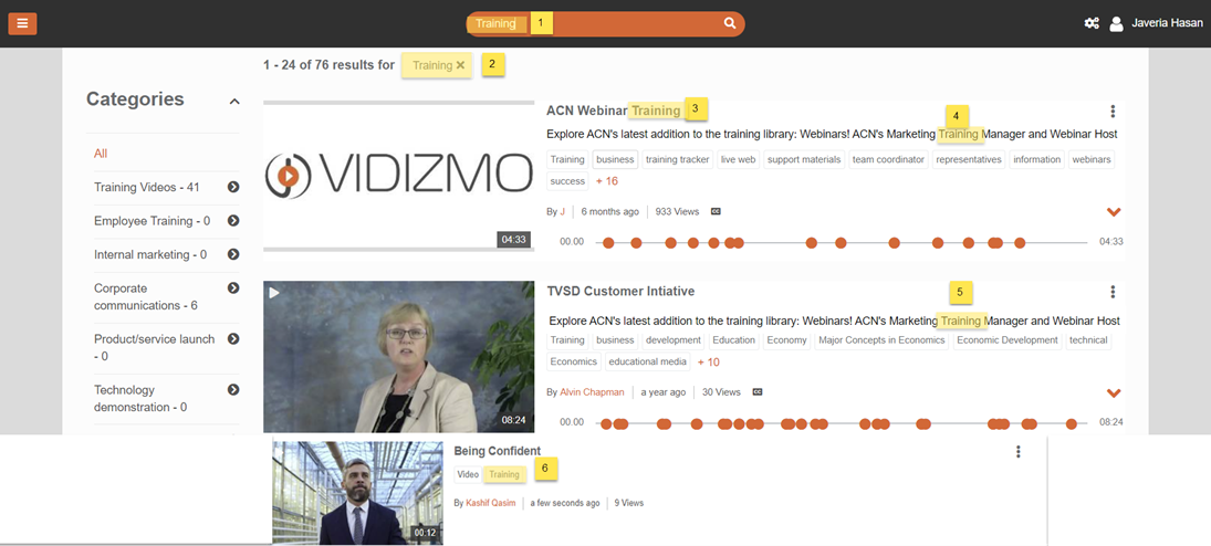 - Search by category: Videos under the same topic category can be collectively bundled and stored in playlists within VIDIZMO, which further improves its search effectiveness. A simple search would reveal results for all videos categorized under a particular topic, either individually or within an organized playlist.