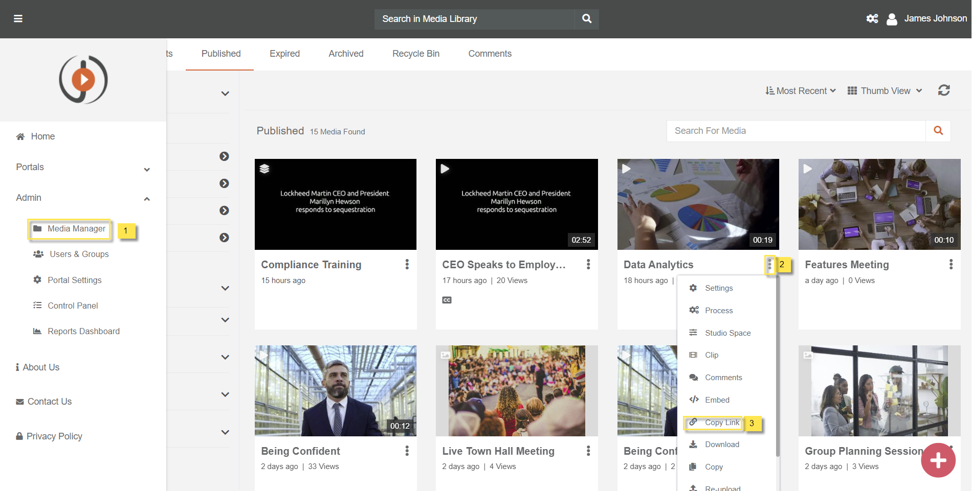 The copy link feature allows you to copy the playback URL of a media file. Media's link can be copied from: