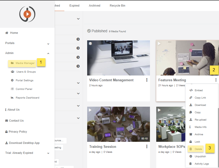 VIDIZMO allows users to delete an uploaded media file from a Portal. When media is deleted, the content is removed from the Portal and storage. However, there is a chance that the media is mistakenly deleted. Hence, for content integrity purposes, VIDIZMO provides an option to retain the deleted content for 30 days by default. The retention option is configurable and can be modified as per requirement. Read How to Set Retention Period for Deleted Content.