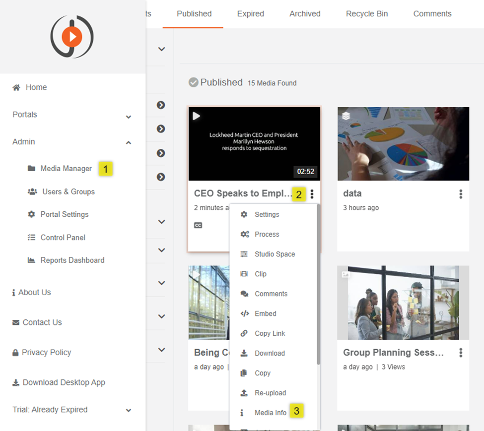 - Towards the bottom right-hand side, click on the overflow menu to expand the list of operations that can be performed on the media.