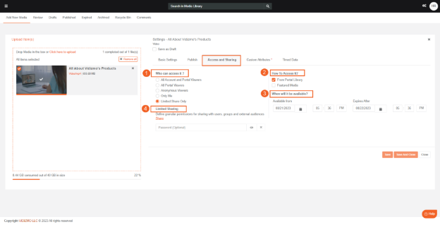 - All portal viewers: When enabled, only registered users on the portal can access the media.