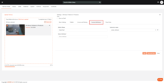 The uploader can also set custom attributes for the media file. These attributes are defined at the portal level. These custom attributes may vary according to what has been defined in your portal. Nonetheless, they can be defined for this media and utilized in search results to enhance end-users search experience and metadata information for
