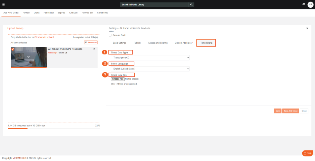 - Timed Data File: VIDIZMO's support for the .vtt file format offers a streamlined approach to adding transcriptions or closed captions. By uploading .vtt files, users can seamlessly integrate timed text data with the media.