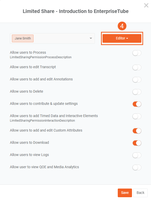 - Selecting Editor allows you to manage permissions for editing or modifications. Users assigned this license can perform these actions on the Media shared with them.
