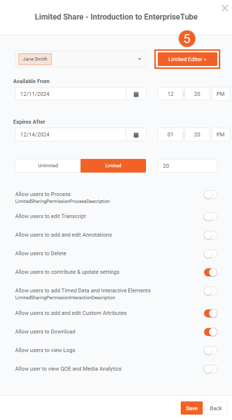 - Selecting Limited Editor allows you to manage editing permissions for the Media and configure the limitations on the license, such as the duration of its availability and the number of views.