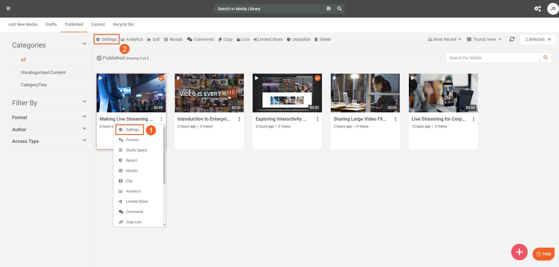 - You can also select multiple Media files, then select Settings from the top menu to adjust their settings in bulk.