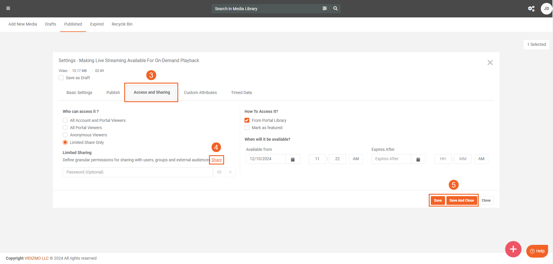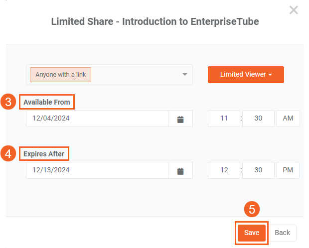 - If Limited Viewer is selected, set the date and time for when the shared Media becomes accessible via the link.