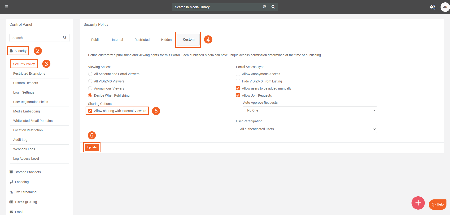 - Under Sharing Options, select the Allow sharing with external Viewers checkbox. Click Update to save your settings.