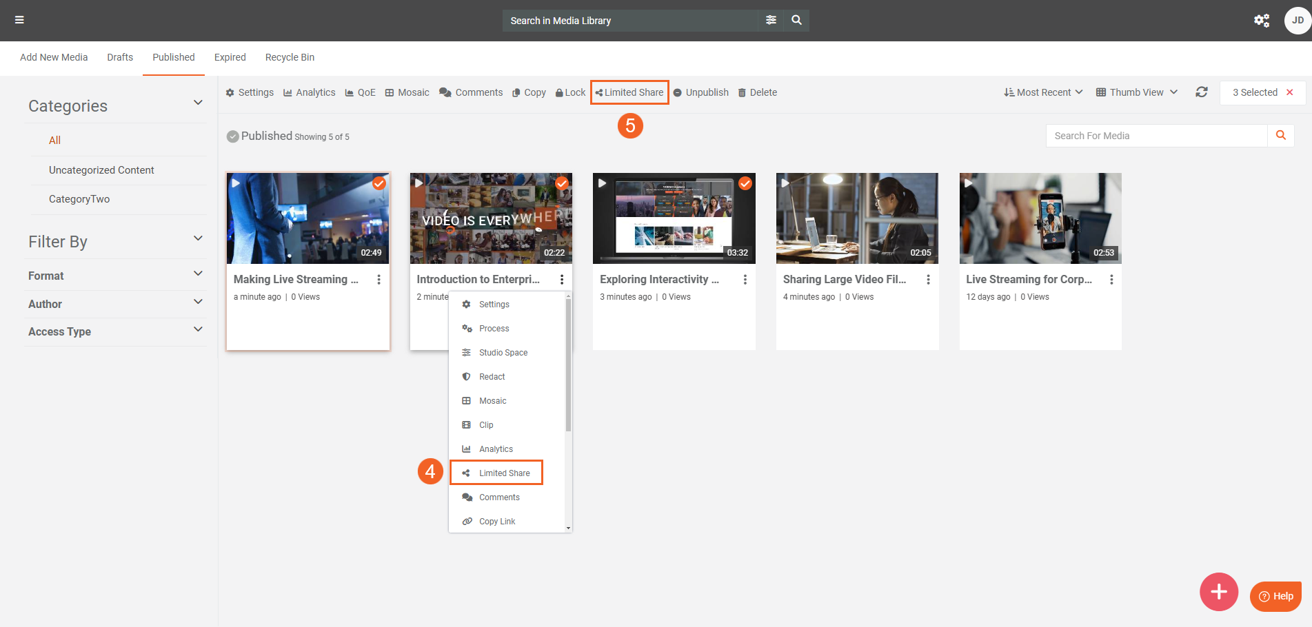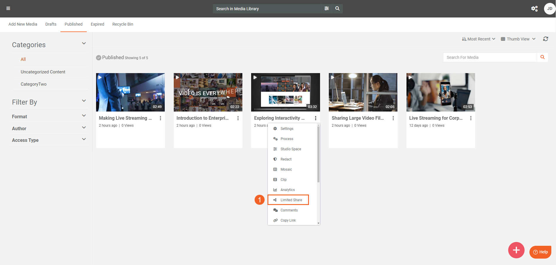 In VIDIZMO, your ability to access, view, or edit Media depends on the permissions assigned to you through a security group. This allows users to manage access at the Portal level, ensuring content security and privacy. However, sometimes you would want to set unique access permissions for specific Media in your Portal's library for certain users. For this, you can use VIDIZMO's Limited Share functionality,