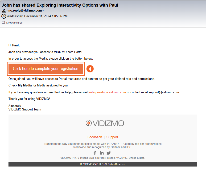 - The external user will receive two emails in their inbox, one containing a link to register as a public user and the other containing the link to the Media. They first need to complete their registration as a public user. For a guide on VIDIZMO Registration visit: How to Complete your VIDIZMO Registration