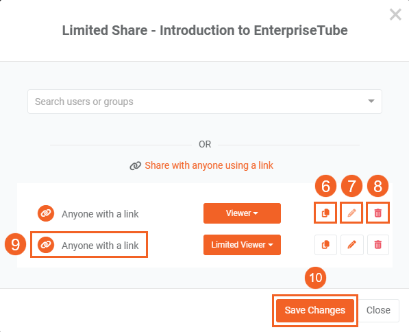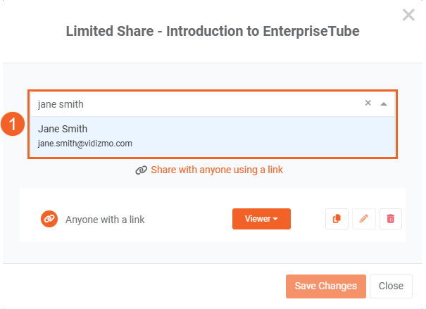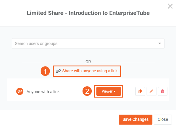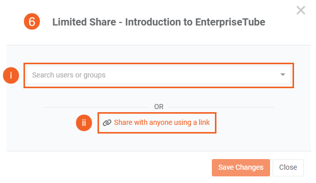 Limited sharing via a link allows you to share your content with anyone using it, even if they are not part of your Portal or registered with VIDIZMO. Anyone with the link can access, playback, or view your shared file. The license or rights you can give someone via a link are restricted to viewing. To create a link for sharing: