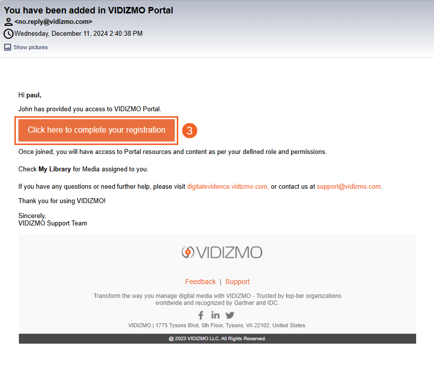 - One email contains a registration link for the VIDIZMO Portal, where the shared Evidence is hosted, and the second email provides a direct link to access the shared Evidence. Open the email containing the registration link for the VIDIZMO Portal. To initiate the registration process, select Click here to complete your registration.