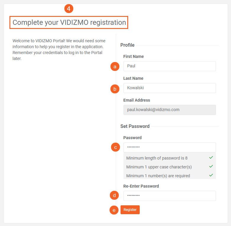 a. Enter your First Name. b. Enter your Last Name. c. Enter a strong password that complies with the requirements. d. Re-enter the Password again for confirmation. e. Click the Register button to complete the registration.