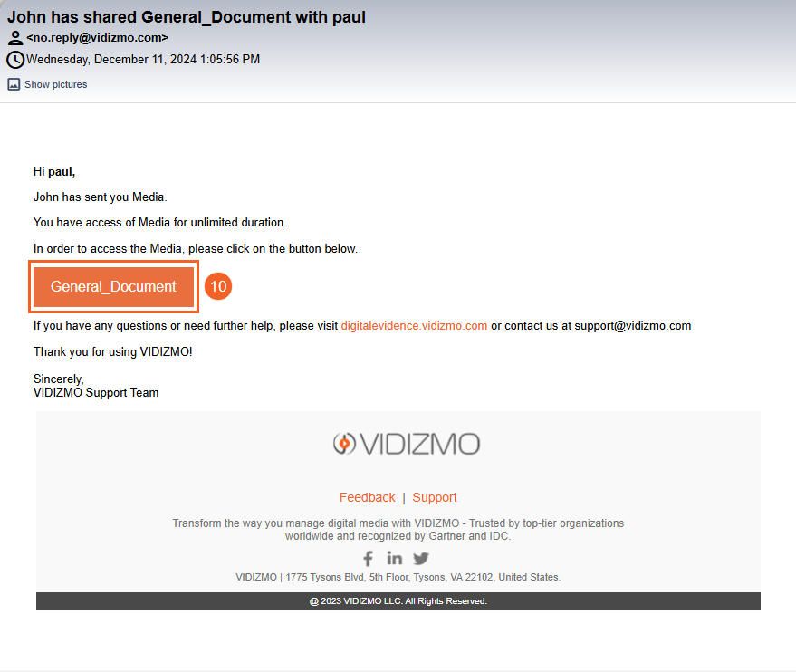 - After the Evidence is sent to you via Limited Share, VIDIZMO will send you two emails to your inbox.