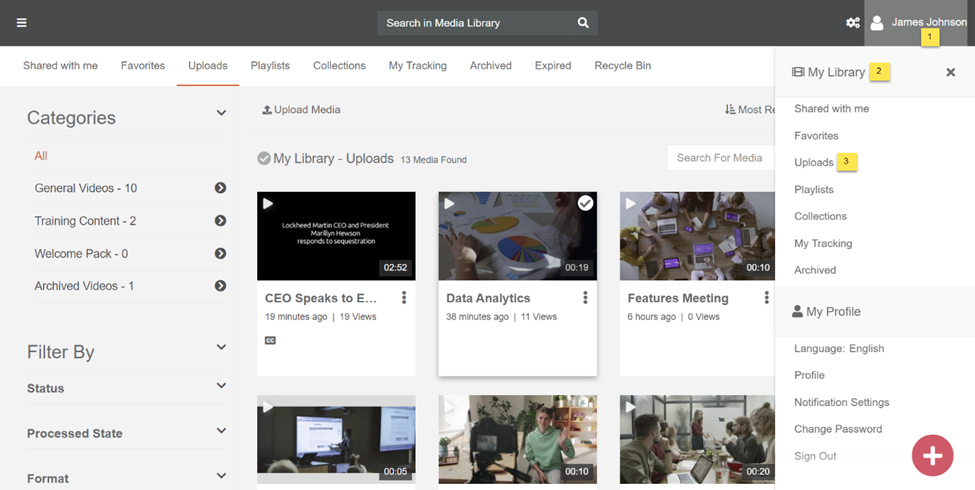VIDIZMO now provides users with a feature of My Media enabling them to upload, playback, manage, sort and filter their uploaded media at one place. In this article, you will learn how to access and manage My Media feature in VIDIZMO's portal.