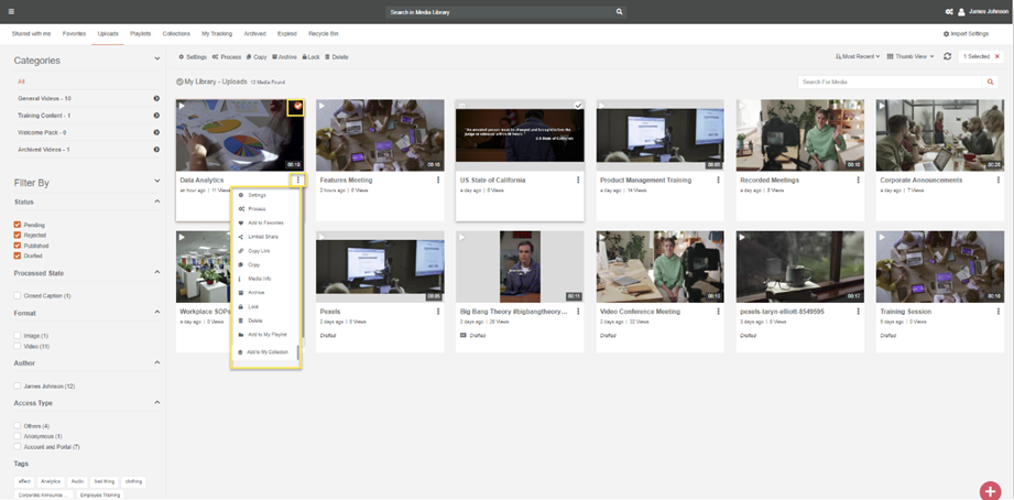 - Search: Media can be searched in My Library by Title, Category, Tags etc.
