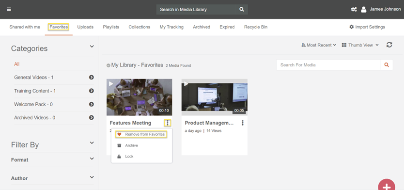 VIDIZMO allows users to add media to favorites so that they can find it later again. In My Library, Favorites displays your media that you added to favorites. After you create your favorites list, you can manage it by removing media from the list.