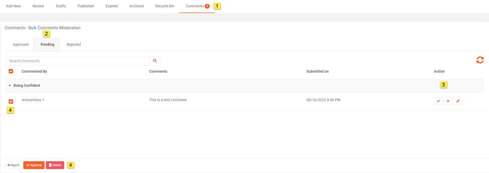 - The orange circle next to the "Comments" tab indicates the number of comments received for moderation.