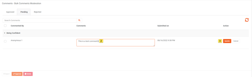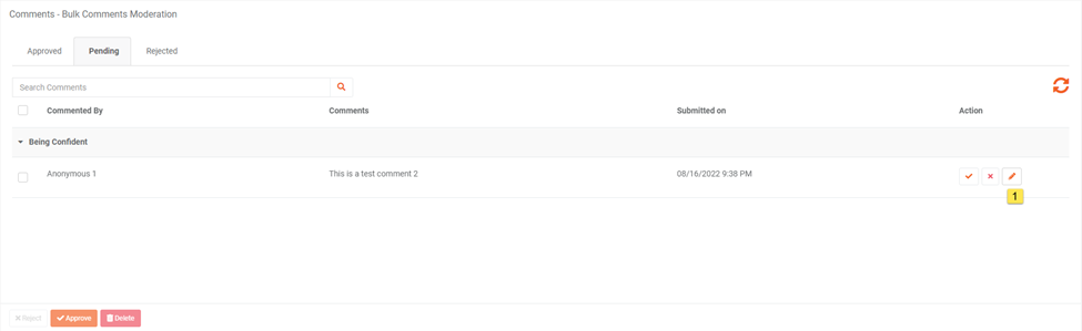 - The Comments screen has three tabs Approved, Pending and Rejected.