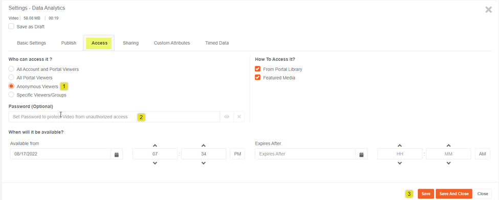 3. Click on the Save and Close button to save your settings. If required, use Limited Sharing from the Sharing tab to set video access options based on which video will be accessible or inaccessible. To learn more about Limited Sharing, click here on How to Setup Media Availability