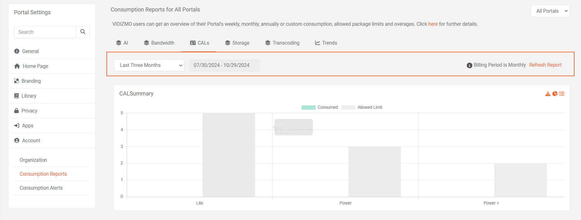 In VIDIZMO, the detailed consumption reports can be utilized by an organization to monitor usage of different services, maintain budgets and overages of the VIDIZMO resource being consumed.