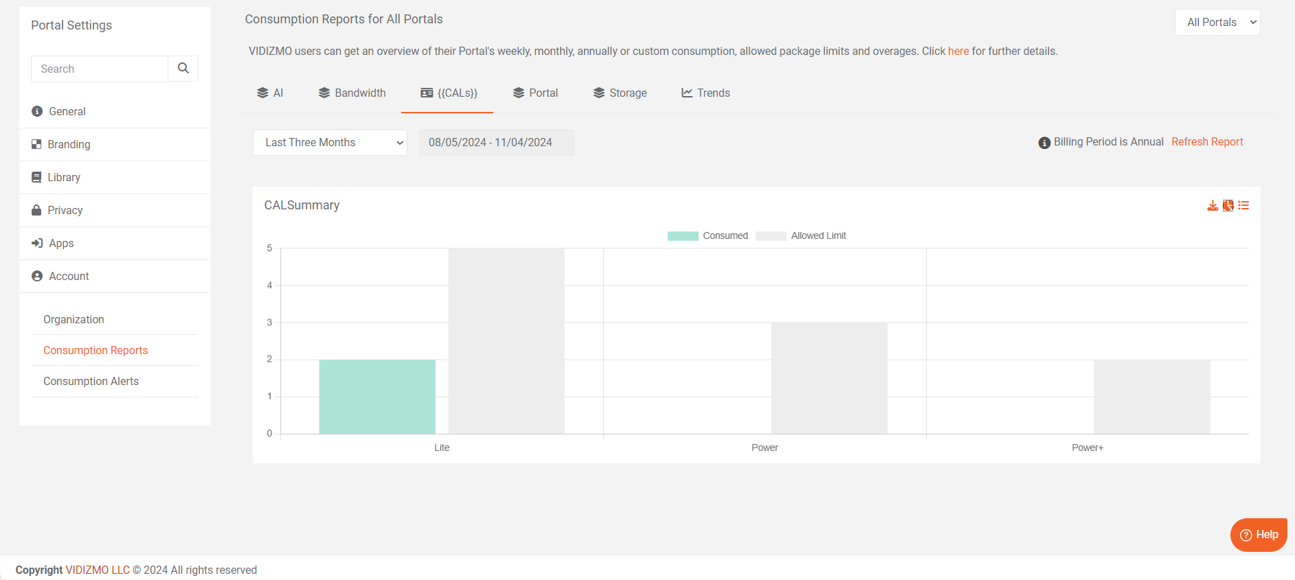 - Users can now access the Consumption Report by utilizing the Billing Period filter, covering the duration from the portal's purchase or creation date until the end of the billing period. The report presents a CAL summary with a visual representation: the green line depicts the CALs consumed by the user, while the grey line illustrates the allocated limit.