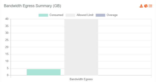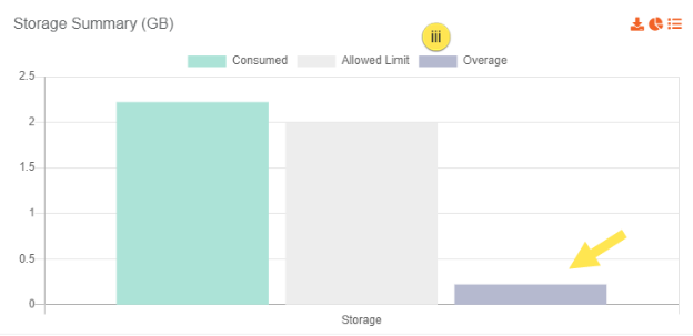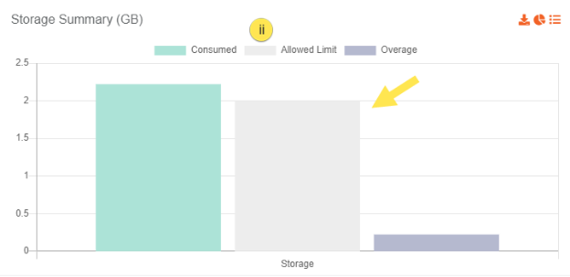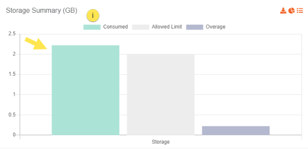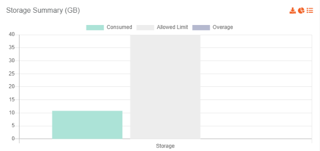On the Consumption Reports screen, there is a separate tab for each category summary which displays the total amount of resource usage, allowed limit and respective overage that is represented in the form of a bar chart. For understanding purpose, let's take the example of Storage summary: