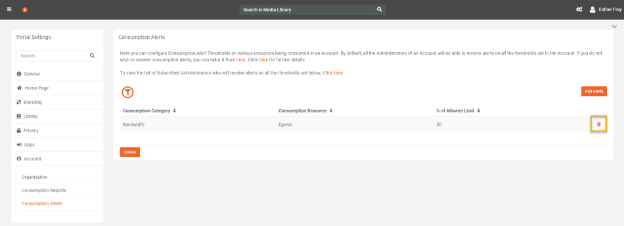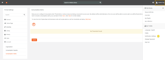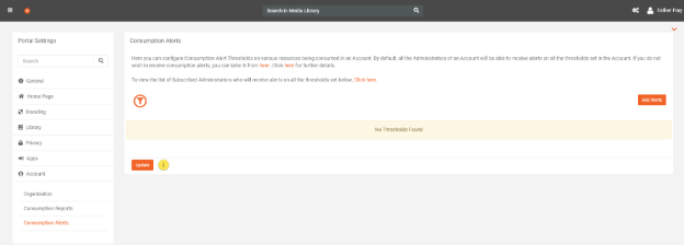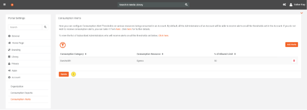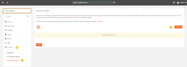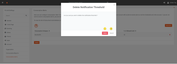 Note: Subscribing to the Consumption Threshold Reached event enables an Administrator to subscribe to alerts for the thresholds set in an Account. Any Administrator, who does not wish to receive consumption alerts email can disable it.